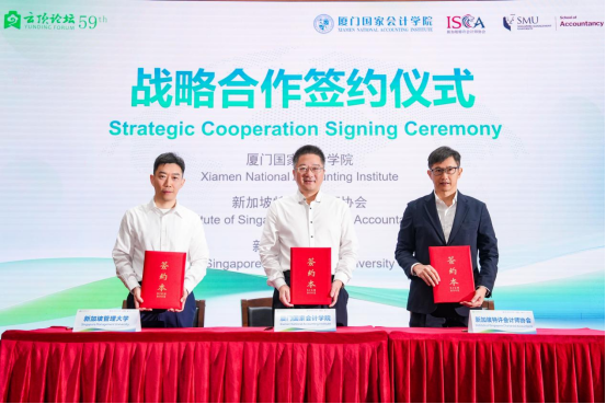 论坛开幕式结束后,厦门国家会计学院、新加坡特许会计师协会、新加坡管理大学三方代表正式签署战略合作协议。未来,三方将在高端论坛、智库建设、研究生教育、线上教育等领域开展深度合作。这标志着中新财经领域合作迈入新阶段,将为区域发展培养具备数字化与可持续发展技能的复合型会计人才。